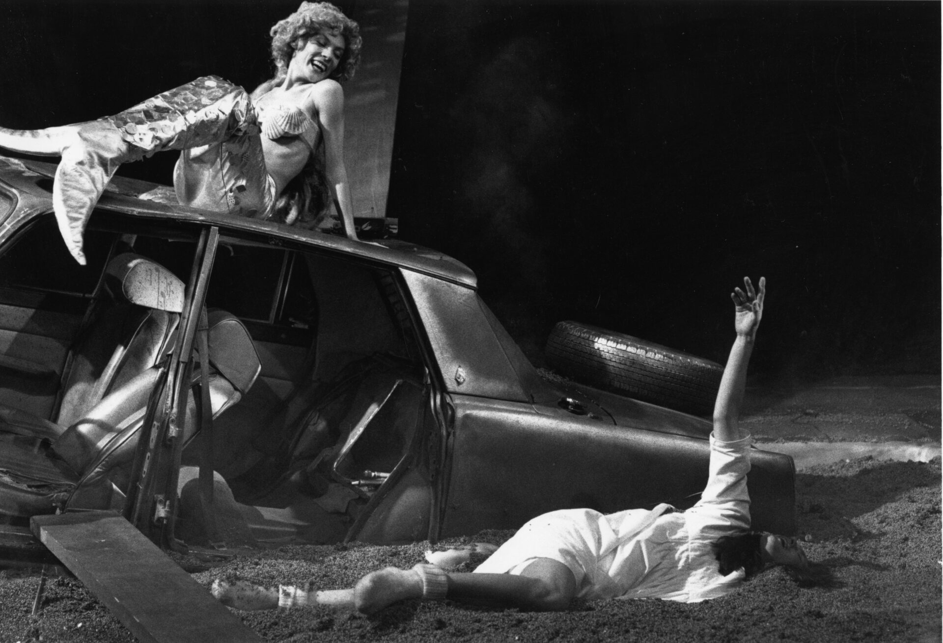 Partendo dall’isola come sogno-ricordo di Wendy, la scenografia doveva prevedere la presenza del mondo dei Darling durante l’avventura nella Terradimai. La scelta di usare una striscia in proscenio con presenze non ingombranti fu abbastanza naturale. Più complessa e difficile fu la chiave per afferrare il mondo di Peter e dei “perduti”. Il desiderio molto forte per me, ma anche per Fercioni, era quello di trovare uno spazio vuoto, una scatola magica. ll blu fu presto deciso: la notte, il sogno – effrazione, il cielo, ma nel vuoto la fantasia diventava magia. E invece ciò che mi stava a cuore era la fantasia come uso diverso della realtà. Ecco, se Pan era lo scatenamento della natura dentro, fuori il paesaggio doveva essere in un qualsiasi luogo dietro la casa dei Darling, i bambini abbandonati diventavano “i perduti” della società, ogni personaggio presente sull’isola era una possibilità dell’animo umano e anche la liberta di poter essere un pirata o un coccodrillo a piacere. […]