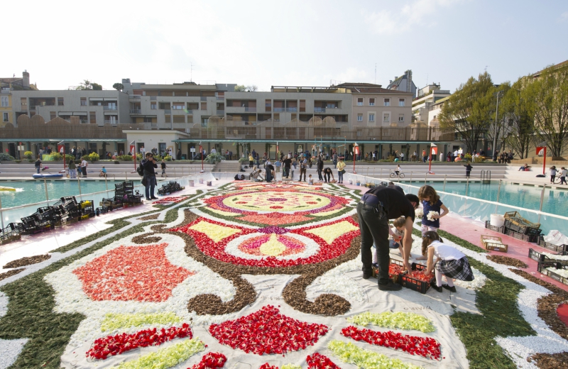 Sabato 7 aprile torna l’antico rito dell’infiorata che già lo scorso anno ha visto la partecipazione di migliaia di cittadini, famiglie e bambini, nella creazione di spettacolari tableaux de fleurs sulla piattaforma della piscina.