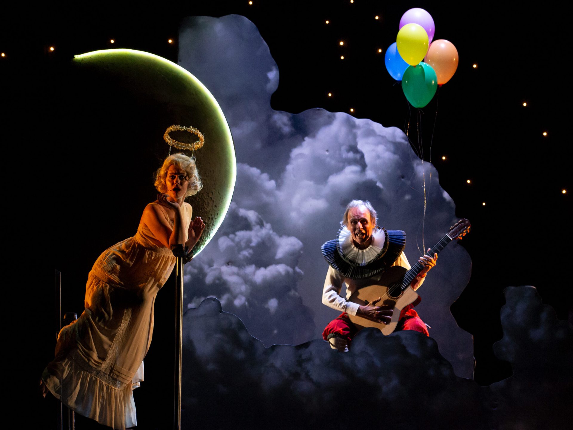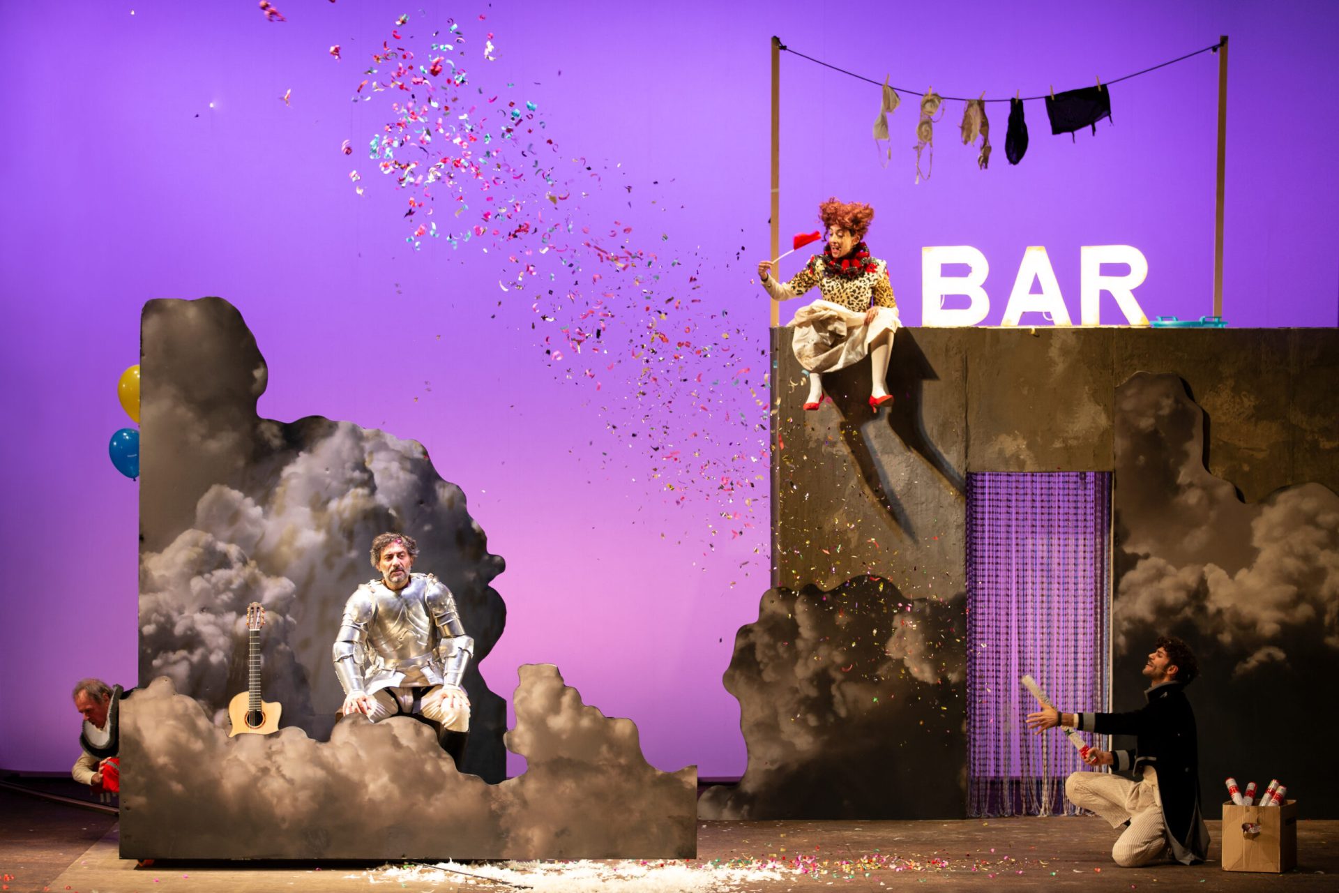 Uno scudiero e un menestrello, una prostituta e l’angelo custode costituiscono la piccola corte che il cavaliere porta con sé e che fa da contorno alla sua figura in un carosello tragicomico. Lo spettacolo semplice e giullaresco, raccontato per stazioni come in una sorta di via crucis o sacra rappresentazione, è anche in parte un omaggio a un certo cinema di Pasolini e alle sue atmosfere