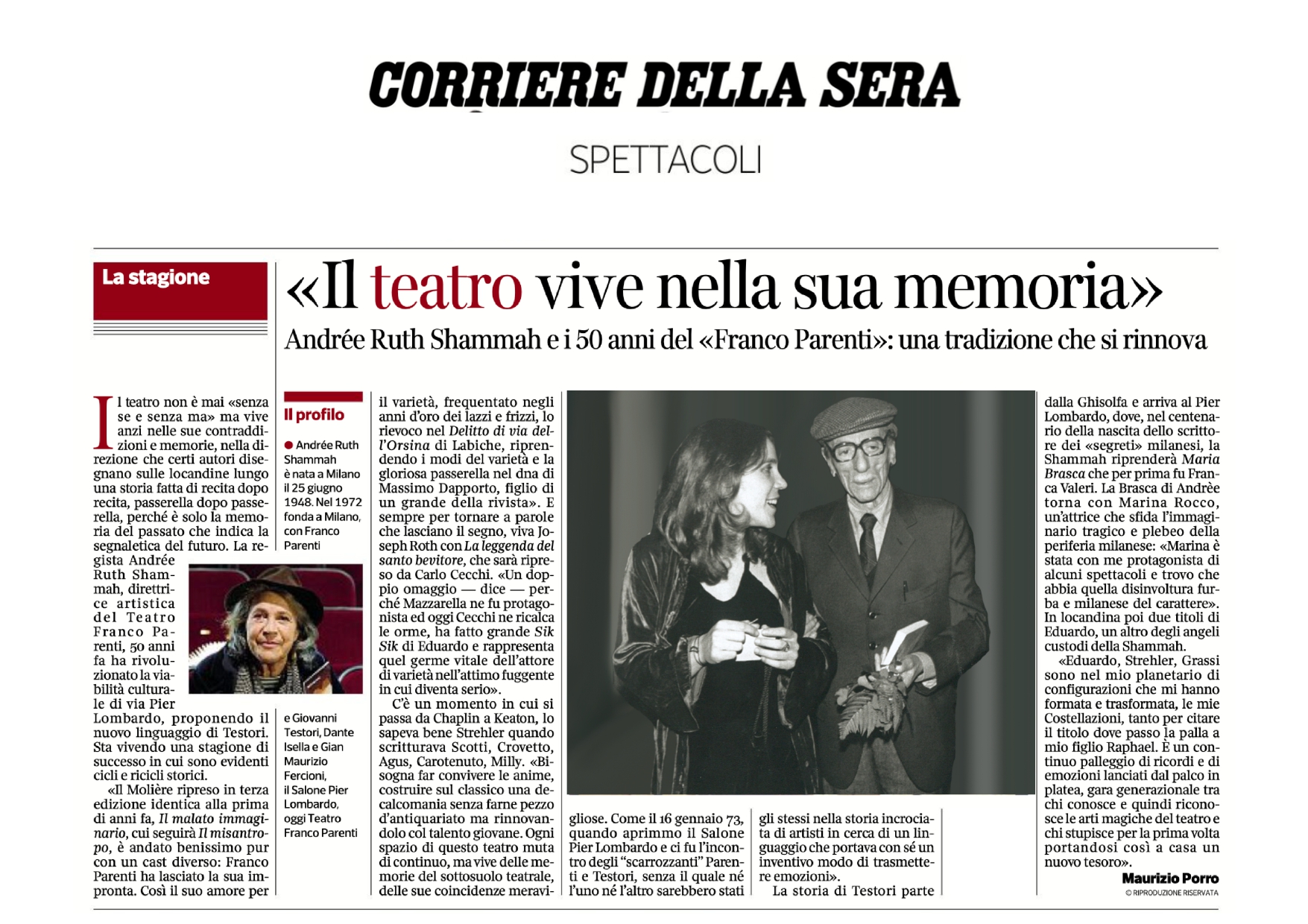 «Il teatro vive nella sua memoria». La regista Andrée Ruth Shammah, direttrice artistica del Teatro Franco Parenti, 50 anni fa ha rivoluzionato la viabilità culturale di via Pier Lomabrdo, prponendo il nuovo linguaggio di Testori. – Maurizio Porro