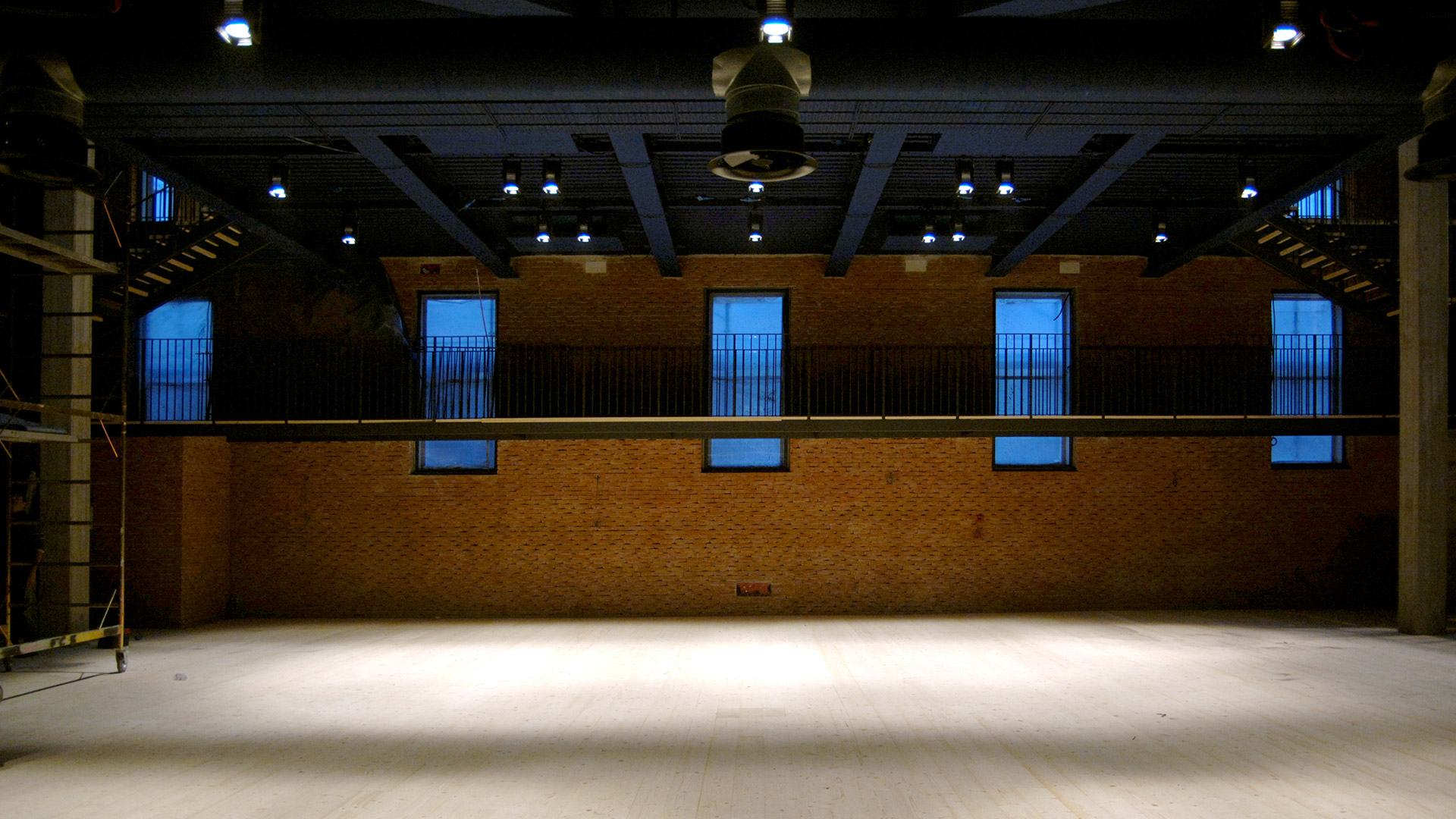 La pavimentazione in assi di legno ripropone il palcoscenico continuo, così come le graticce a soffitto consentono di allestire scenografie e quinte teatrali.
