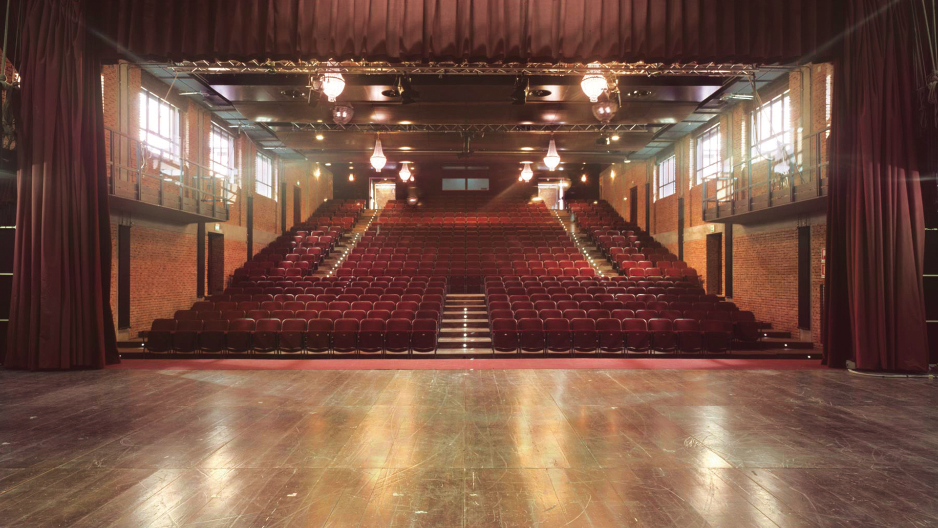 Una serie di finestre aperte sulla parte alta dei muri longitudinali consente l’ingresso della luce diurna. Il muro di fondo del palcoscenico è in mattoni grezzi, nuovi nella parte inferiore, vecchi nella superiore, testimonianza della volontà del Teatro di rinnovarsi sulla propria storia.