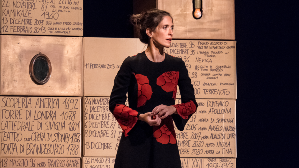 Mentre il pubblico prende posto e chiacchiera distrattamente, Valentina Minzoni è già in scena, sembra serenamente indaffarata e ogni tanto lancia qualche discreta occhiata alla platea. È circondata da scatoloni di cartone, distribuiti disordinatamente nello spazio: alcuni sono aperti, alcuni chiusi, alcuni ripiegati. L’attrice piano piano li riordina, sigillandoli con un nastro adesivo. Il pubblico la osserva giusto per un momento, ma dopo pochi istanti già rivolge l’attenzione ad altro, come se non fosse lecito osservare ciò che accade sulla scena di uno spettacolo che ancora deve iniziare. Minzoni, anche autrice della pièce, dà vita ad una breve rappresentazione che si ispira alla vita della nonna Tina: tra aneddoti, eventi e storie che si intrecciano con gli inevitabili sviluppi dell’Alzheimer.