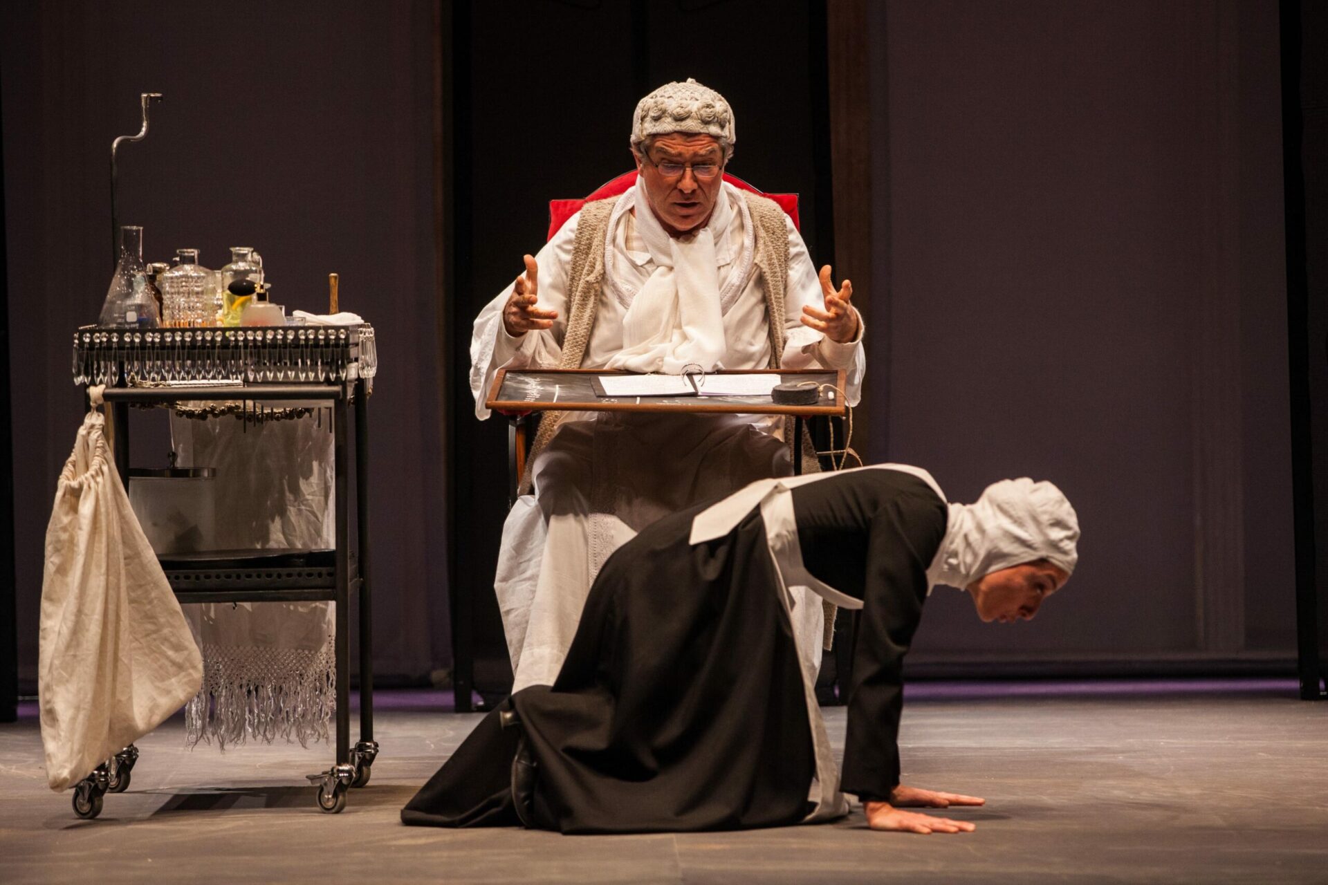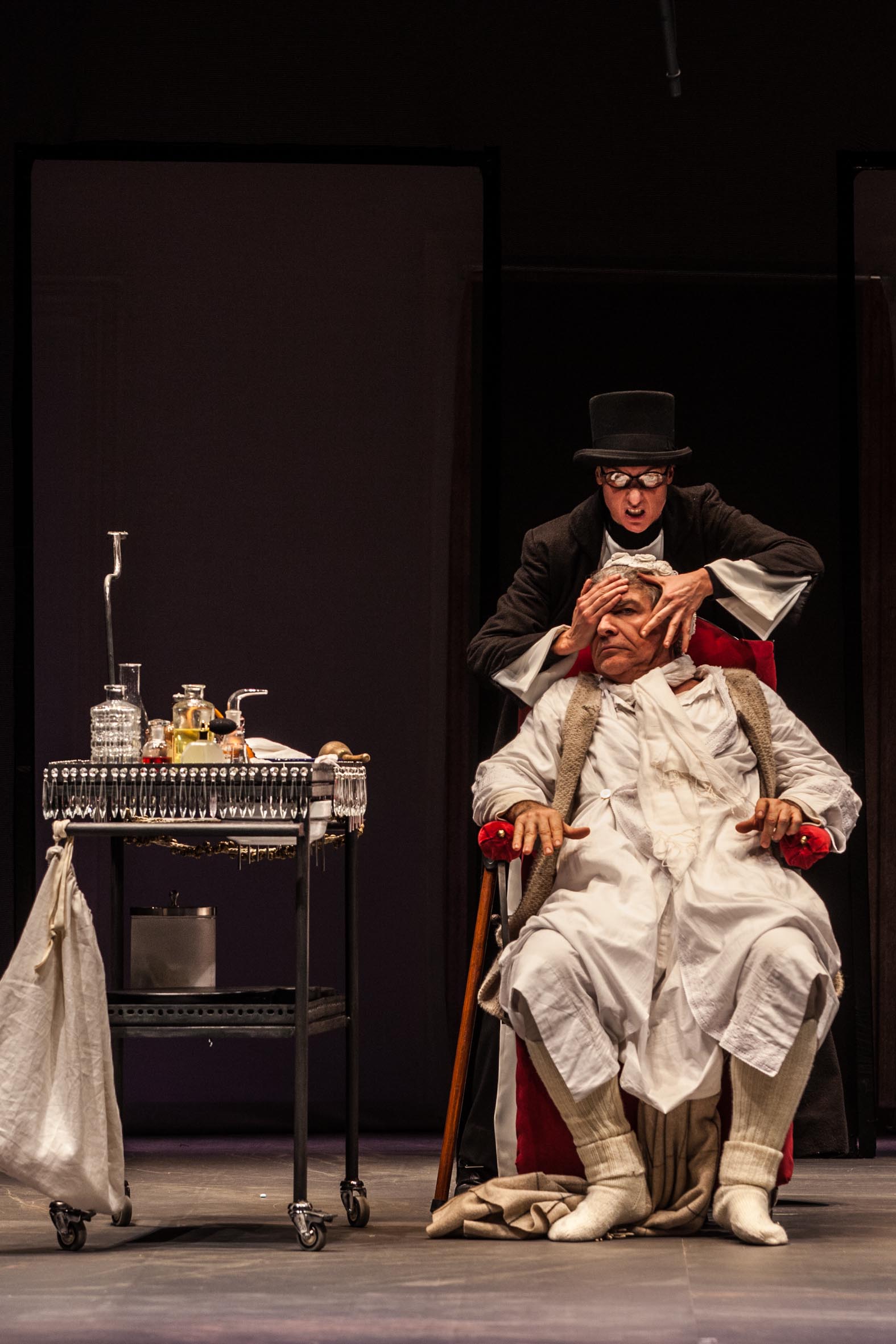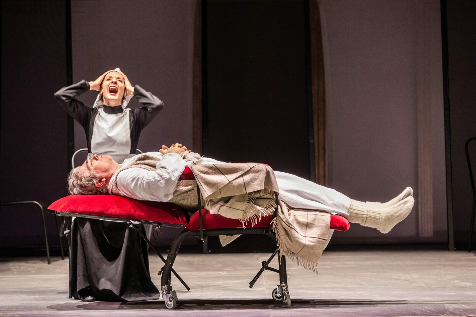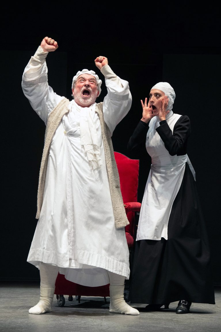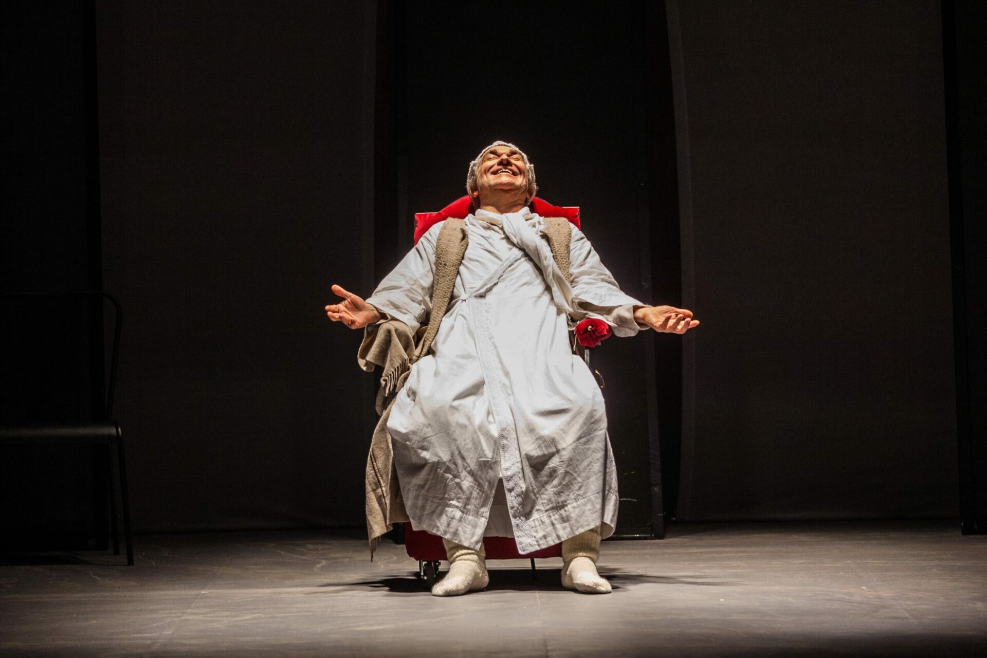 Sotto la candida cuffia di pizzo, con la vestaglia bianca e le calze molli sui piedi ciabattanti, l’Argan, interpretato con intelligenza e ironia da Gioele Dix, testimonia la paura e la solitudine del nostro tempo, l’incapacità genetica di prendere decisioni.